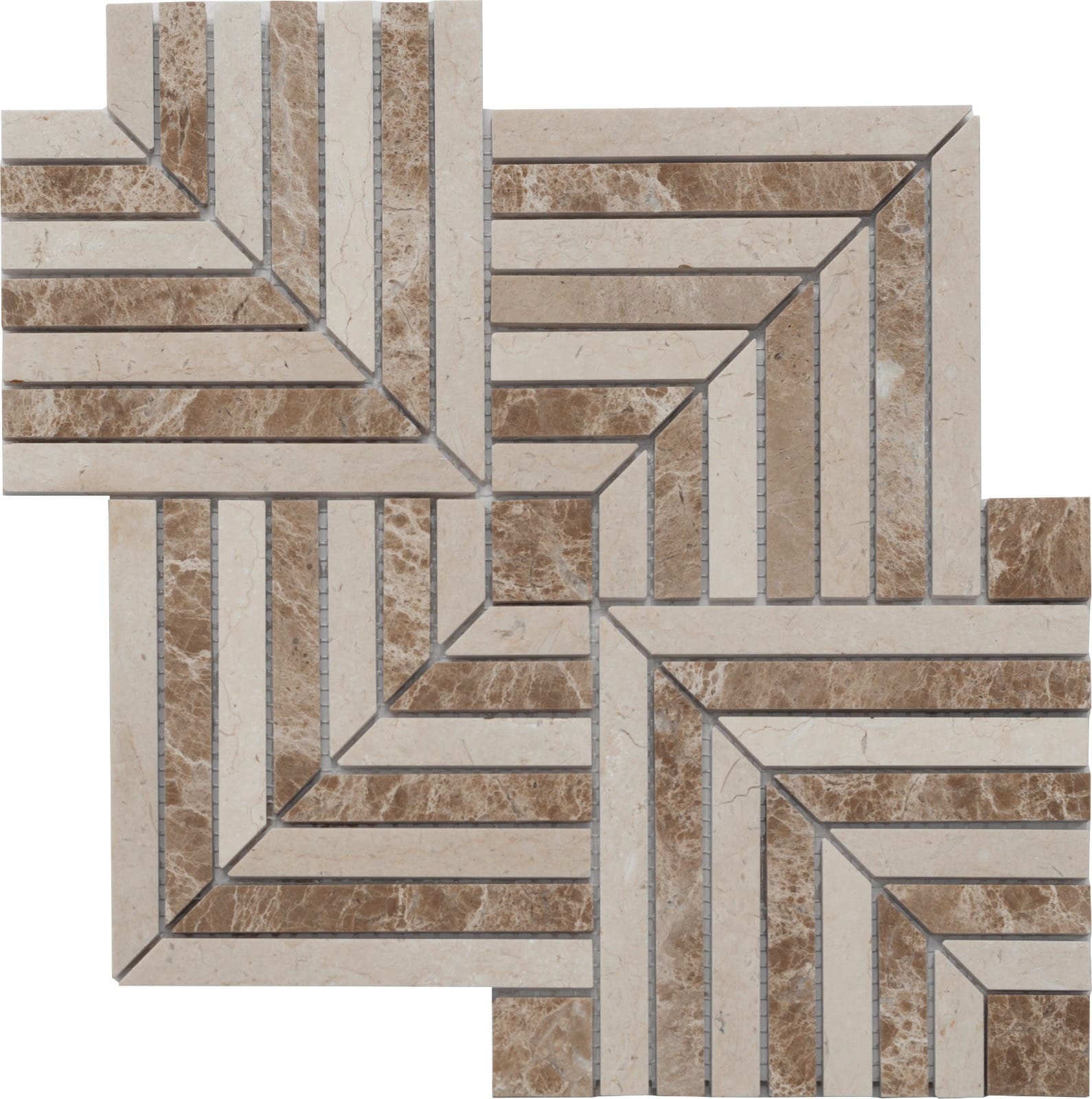 Harlow Harlow Emperador Light Marble 30x30x0,5 cm combineert zacht getinte natuurstenen stroken in een harmonieus geometrisch motief. De warme kleuren en het subtiele contrast zorgen voor een rustige, elegante sfeer. Dankzij het formaat van 30x30x0,5 cm is deze mozaïek tegel geschikt voor zowel wand als vloer, bijvoorbeeld in een luxe badkamer, toilet of hal. Het raster zorgt voor eenvoudige plaatsing met een naadloos eindresultaat.