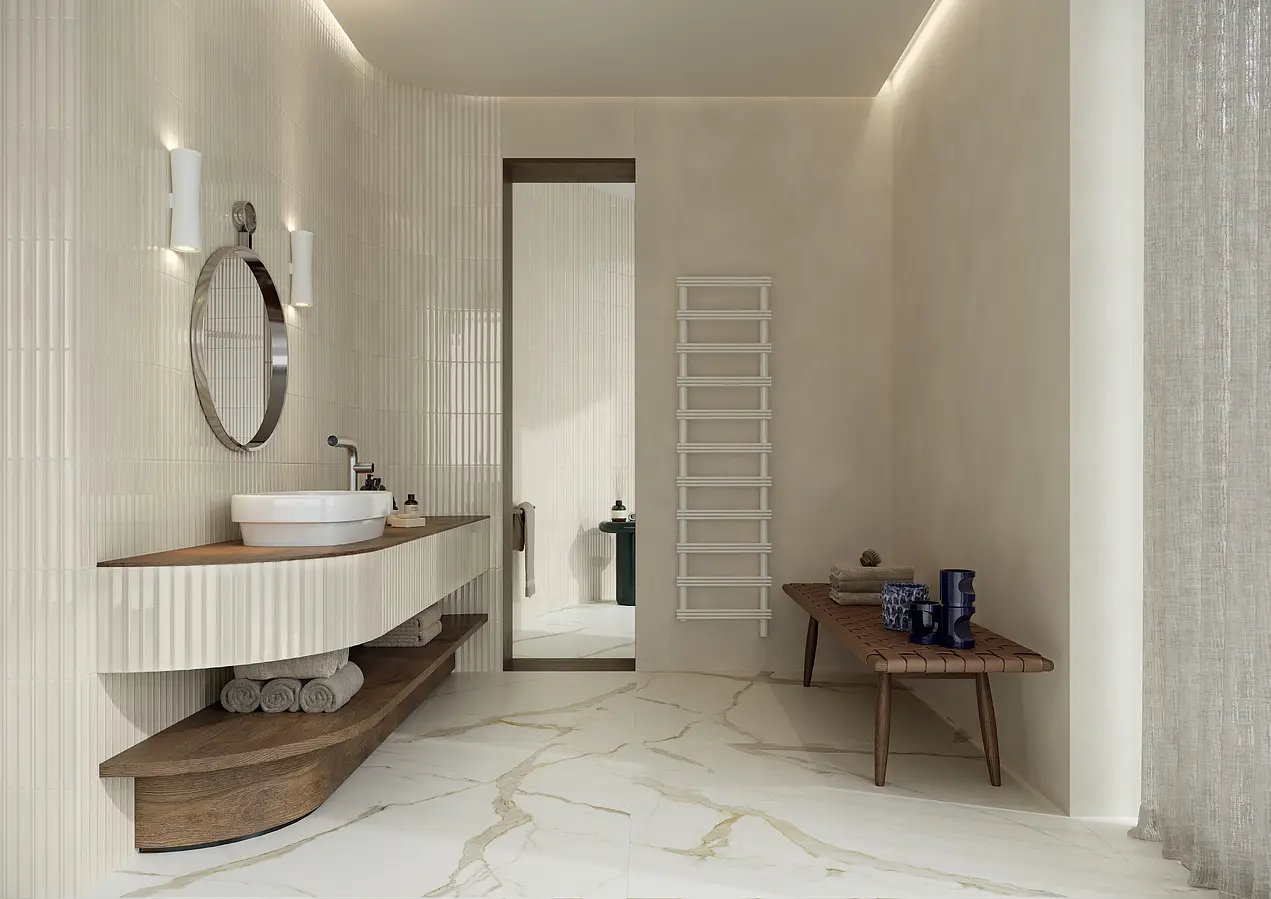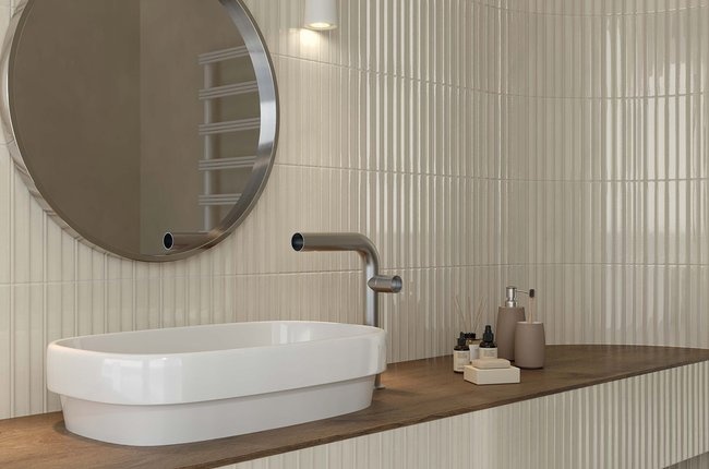 Het reliëf van de Marca Corona Miniature Rima Burro 6x24 cm versterkt de lichtval en geeft de wand een subtiele beweging. Deze kleur laat zich uitstekend combineren met natuursteenlook of houtlook tegelvloeren. Ideaal voor tijdloze badkamers en warme wooninterieurs.