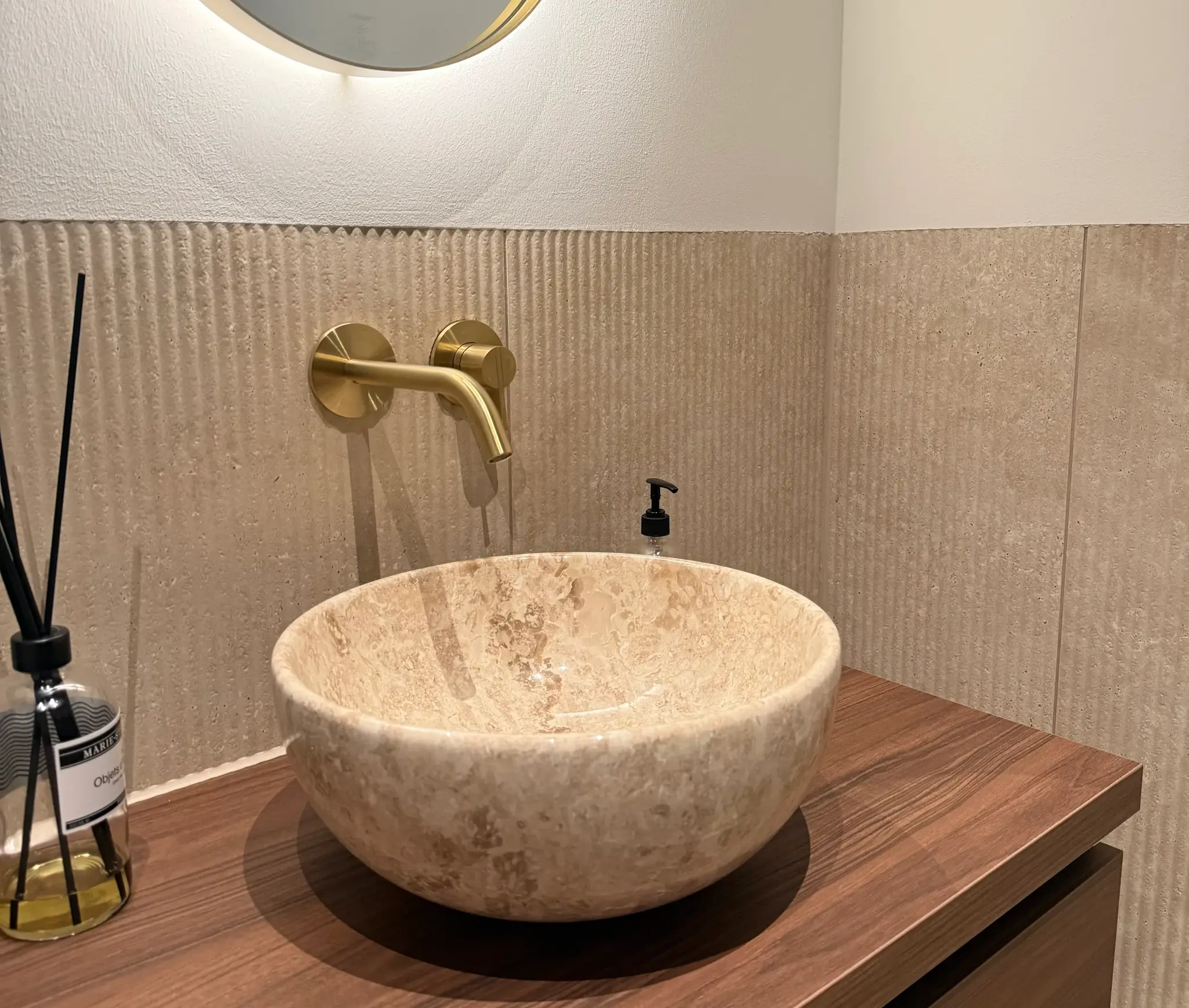 U ben van harte welkom bij ons in de showroom om een voorbeeld van de waskom Lagoa Beige te bekijken.