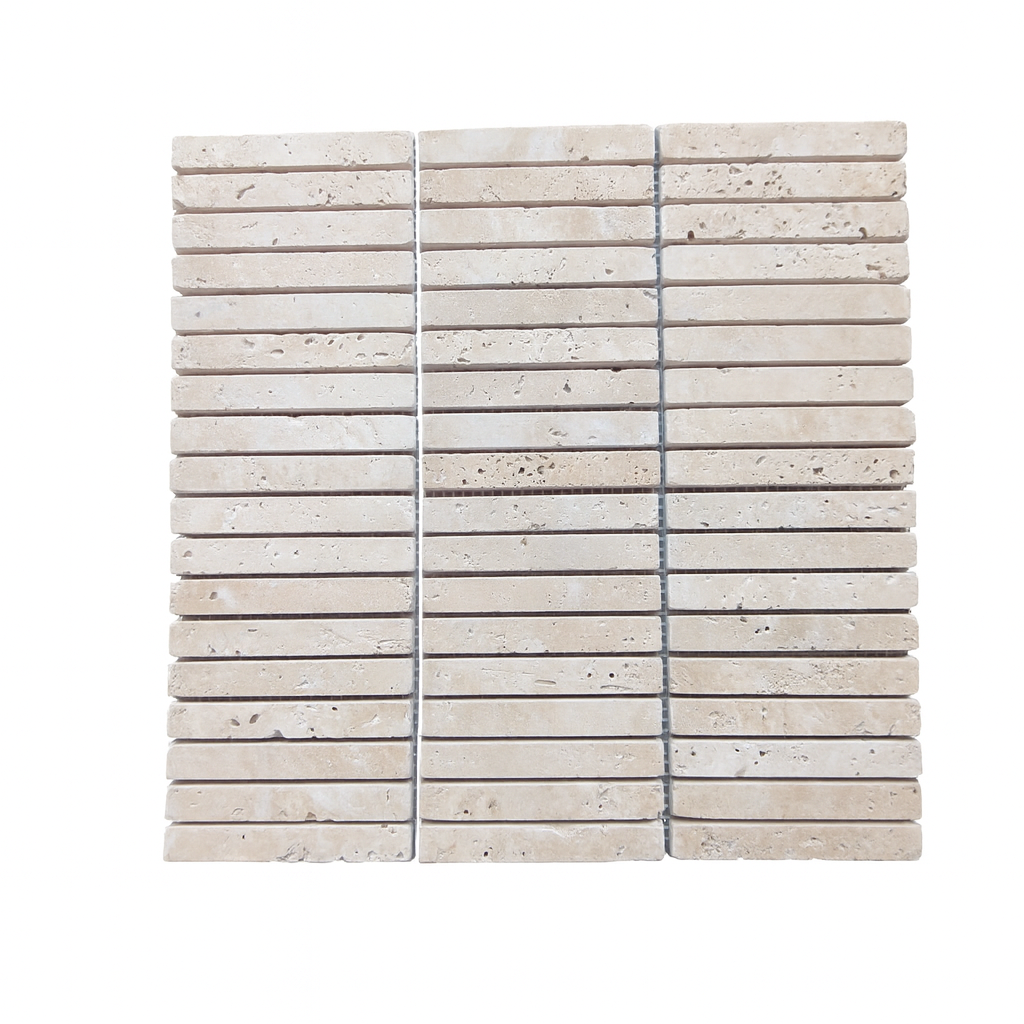 Deze KitKat mozaïek van Travertin Light Tumbled combineert natuurlijke charme met een eigentijdse vorm. De smalle stroken (1,5x10 cm) zijn geplaatst op een mat, waardoor ze eenvoudig te verwerken zijn. De lichte tint en het speelse reliëf geven een luxe en warme uitstraling aan elke ruimte. Ideaal voor achterwanden, douches, toiletten of als verfijnd detail in de keuken. Dit product is vocht- en hittebestendig. En daarom geschikt voor een spatwand of rondom de open haard.
